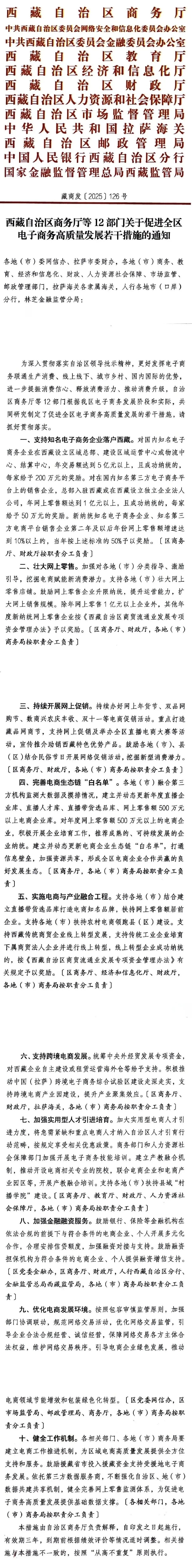 日前,西藏自治區商務廳官網公布了《西藏自治區商務廳等12部門關于促進全區電子商務高質量發展若干措施的通知》,包括支持知名電子商務企業落戶西藏、壯大網上零售、持續開展網上促銷、完善電商生態鏈“白名單”、實施電商與產業融合工程、支持跨境電商發展、加強實用型人才引進培育、加強金融融資服務、優化電商發展環境、健全工作機制十條內容。詳情如下: