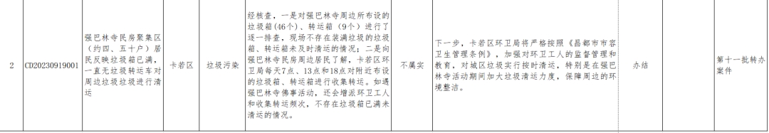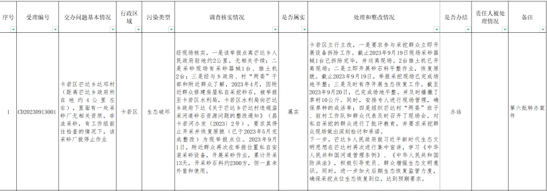 截至2023年9月22日,西藏自治區生態環境保護督察第三督察組共向我市轉辦群眾信訪舉報案件13批次71件(來信3件),目前已辦結52件(不屬實18件),階段性辦結1件,剩余未辦結案件已明確責任單位,正按相關程序積極推進辦理。已公示51件,現將今日辦結2件信訪舉報案件情況進行公示。
