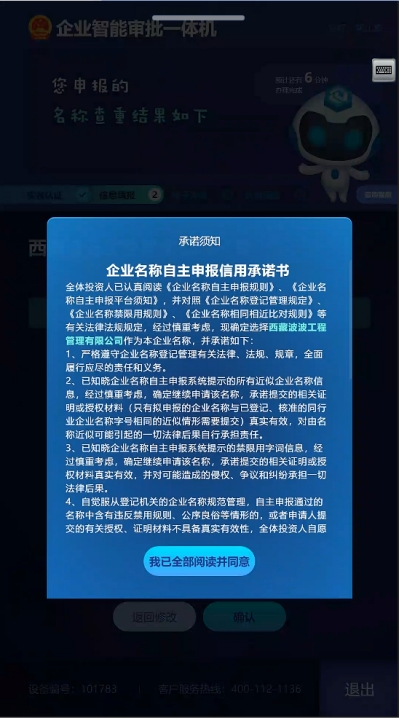 6.查重通過后,需要同意企業(yè)名稱自主申報信用承諾書。在讀秒結(jié)束后點擊“我已全部閱讀并同意”。如圖11所示: