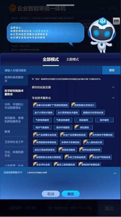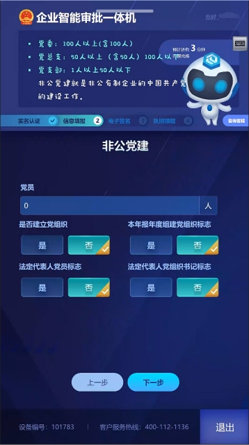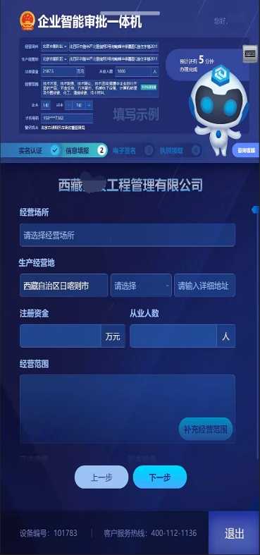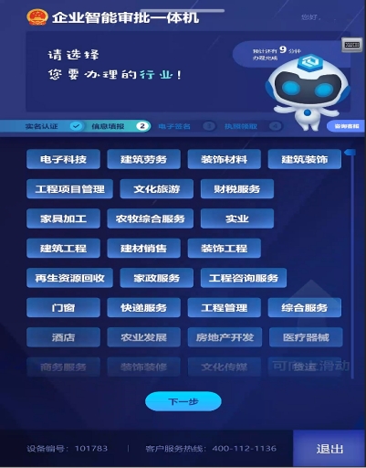 1.選擇開辦的企業(yè)類型,申請人根據(jù)自己需要開辦的行業(yè)類型進行選擇并點擊相應(yīng)的模塊,確定后點擊“下一步”進入信息識別頁面。