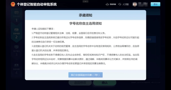 核名通過后點擊“確認”進入字號選用承諾通知書,請仔細查看相應內容。在讀秒結束后點擊“我已全部閱讀并同意”。如圖9所示: