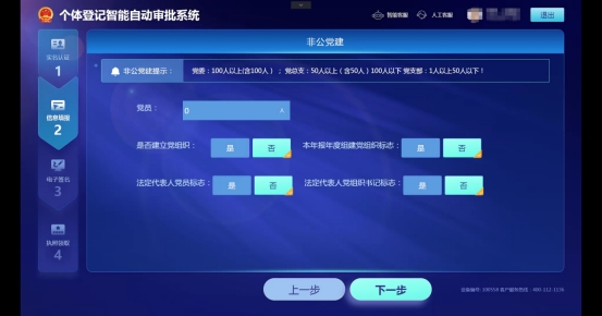 進入非公黨建填報頁面,填寫非公黨建信息,有黨成員請進行實際情況填寫,沒有黨成員即可直接點擊“下一步”。如圖12所示: