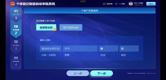 點擊需開辦的個體工商戶類型,進入自主核名頁面,依次選擇名稱區劃-輸入字號-選擇組織形式,并點擊“下一步”進行名稱核準。如圖6、圖7所示: