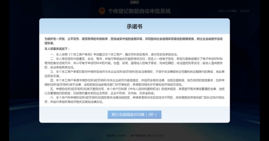 點擊圖1中“個體智能審批”進入以下頁面,會彈出承諾書,請申請人仔細閱讀,讀秒結束點擊“我已閱讀并同意”。如圖2所示: