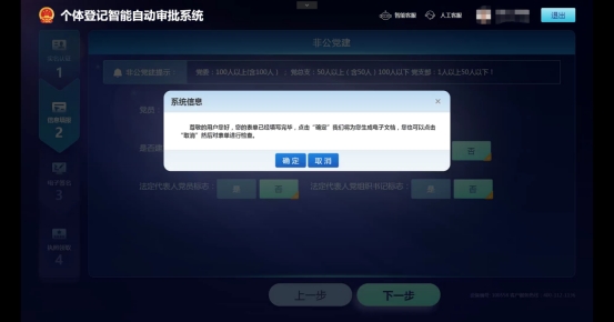 確認所有填寫的信息無誤之后,請點擊“確認”即可生成電子檔案PDF文檔。需要修改信息的可點擊“上一步”進行退回到相應的模塊進行修改信息。請申請人仔細核對信息是否無誤。如圖13所示:
